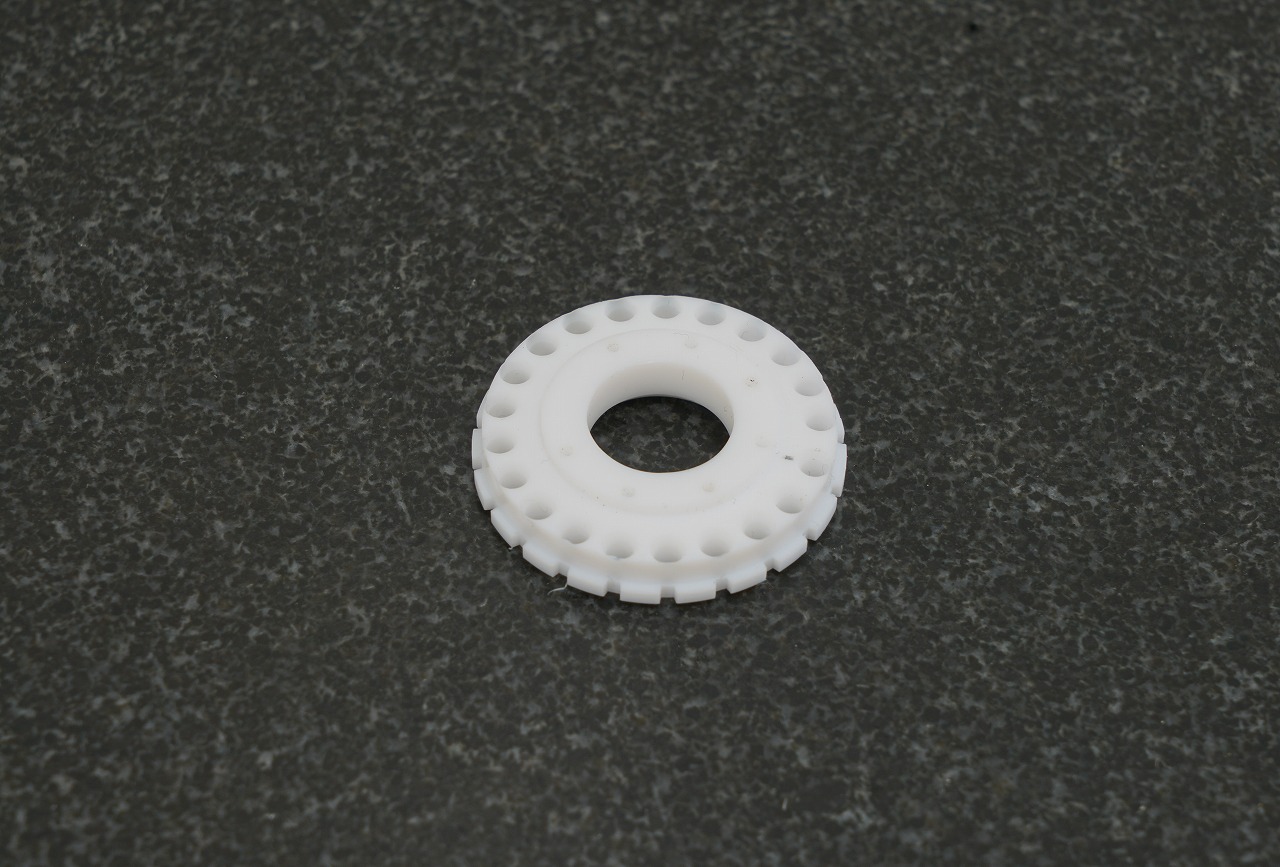こちらは、ジュラコン® の社内治具です。本事例も複合旋盤で加工することで、工程を集約し、リードタイムの短縮・コストダウンを実現しています。