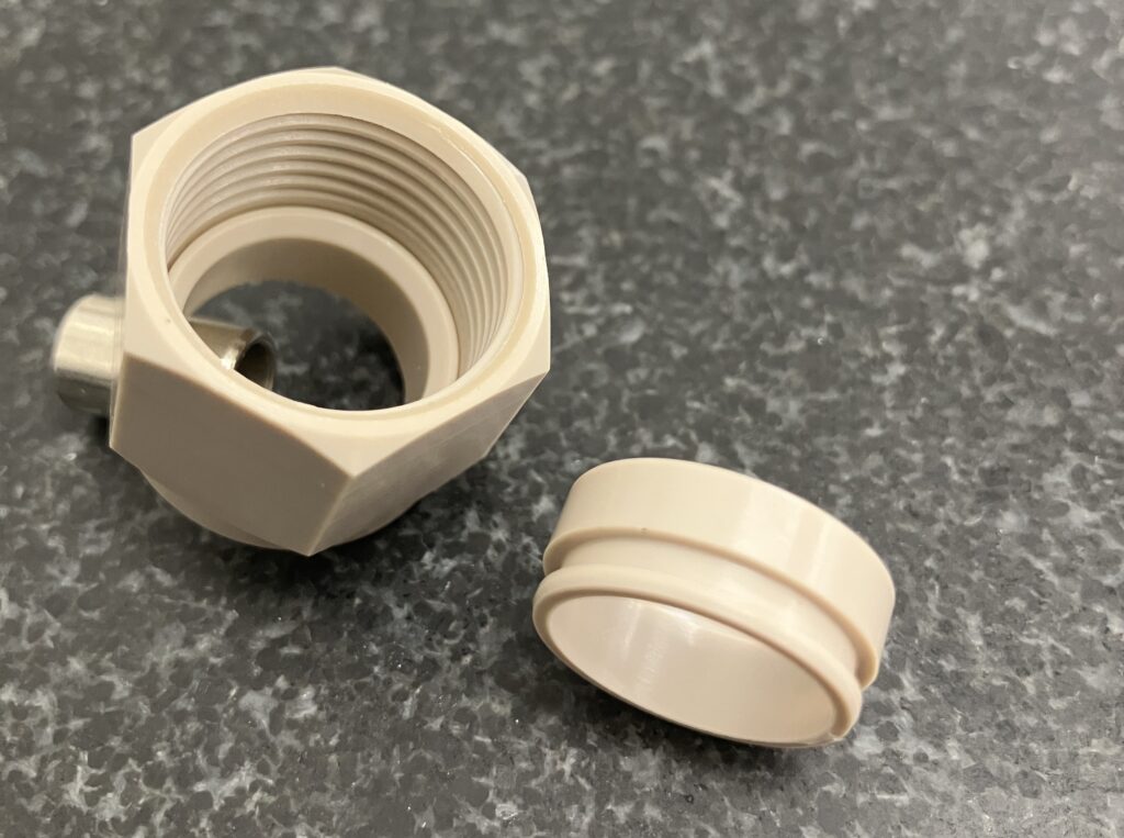 本事例は、ステンレス製締付継手の生産中止に伴い、代替製品を樹脂で提案したものです。お客様からは軽量化と堅牢性に加え、耐薬性・耐熱性を兼ね備えた素材が求められていました。そこで当社ではPEEKを採用しました。PEEKは薬品や腐食性流体、各種洗浄液にも耐え、長期安定性に優れるため最適と判断しました。また、施工性を確保するため、ナット内にスリーブを打ち込む一体型構造を設計し、配管接続時のねじれ防止を実現。さらに、スリーブ径を調整可能とすることでカスタマイズ性を高めています。結果として、金属から樹脂へ切り替えながらも、軽量化・信頼性・使いやすさを兼ね備えた締付継手を提供することができました。